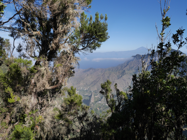 El Cedro 8km, the sign had said. Easy. There wasn’t much of a path, so we followed the big water pipe that led upwards and into the narrowing barranco (valley). But the moderate steps from the beginning soon turned into big slippery rocks, trunks, and drop-offs. Becoming more of a challenge, becoming more thrilling. Whenever we turned around to take a look we had gained a few more meters altitude, and the view was getting more and more spectacular. Dense undergrowth, followed by a sudden opening and another mirador, vista point. Then the Teide came into sight, Spain’s highest mountain on nearby Tenerife, its bottom veiled in clouds. …
