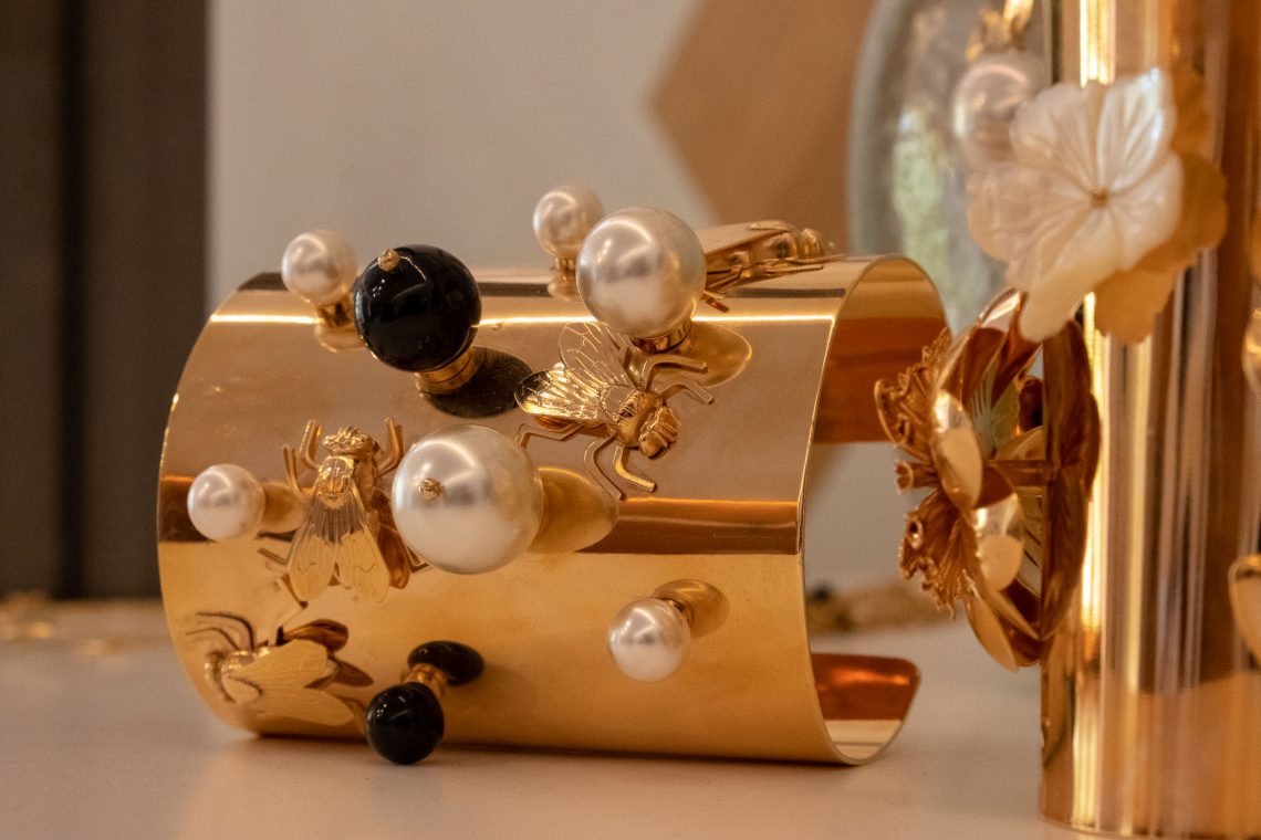 Not really. Can be the memory of a friend I just met, or simply a piece of material lying on my desk. Something I play around with, can be anything – a stone, feathers, a piece of wood or mother of pearl. The only substance I don’t work with that much is silver. I am a gold girl. And I love to mix and match materials.