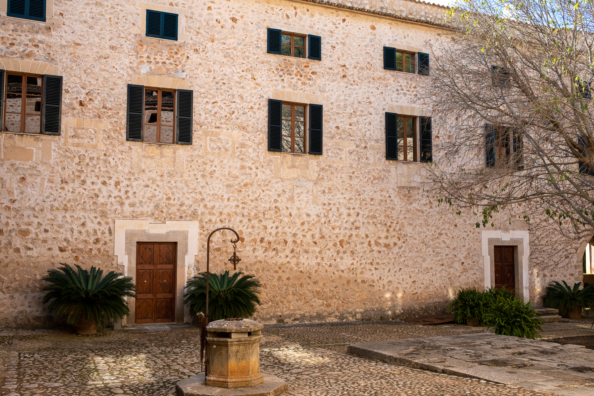 A small bridge leads up to the mansion at the foot of the hill. Three stairs to both sides of the main entrance of the building remind of a time when people arrived by horse. The courtyard with its draw-well is typical of a Mallorcan country house. To the outside though the manor opens up to an ornamental garden and the entire bay of Palma. The terrace is lined by columns, hydraulic tiles decorate the floor.