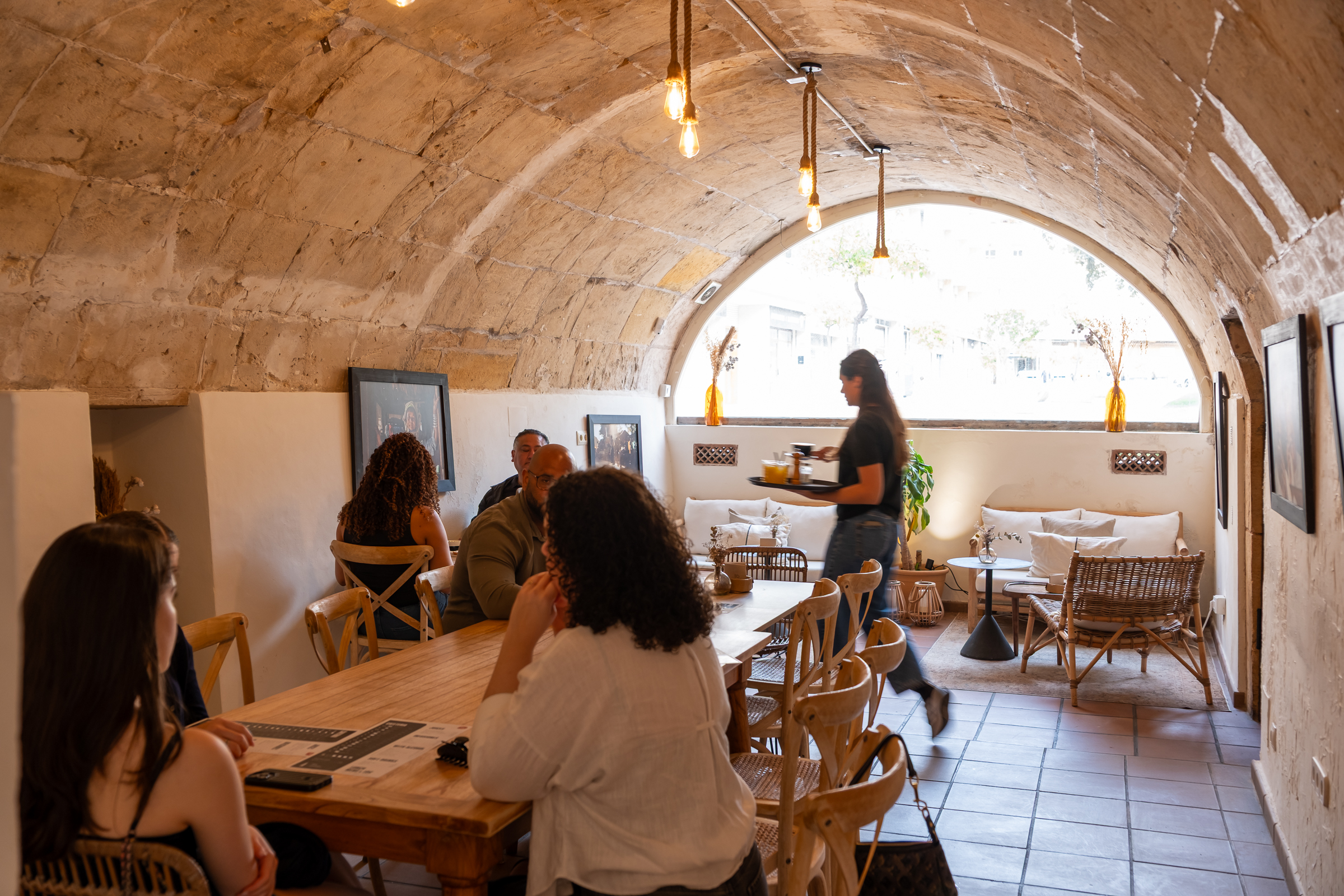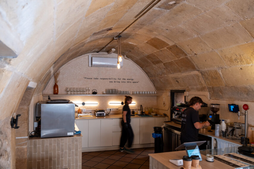 There’s something poetic about grinding coffee in a place that was built for grinding. Sāntal Café has found its home inside one of Santa Catalina’s old mill buildings and the fit feels almost inevitable. Step through the door and the history of the space wraps around you quietly. Thick stone walls, a ceiling that reaches a little higher than you’d expect, and light spilling generously through large windows that frame the street like a painting.